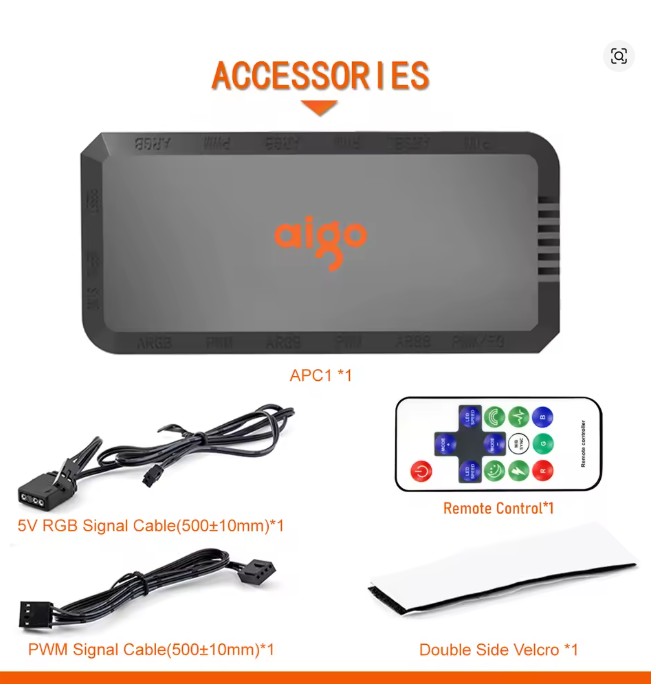Controlador AIGO APC1 ARGB + PWM, ideal para organizar e controlar a iluminação e rotação dos fans do seu gabinete. Suporta até 6 fans ARGB (5V 3-Pin) e 6 sinais PWM, com alimentação via SATA e opção de controle por controle remoto ou placa-mãe compatível.
